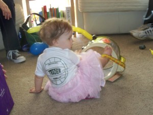 But now that I’m a mom, that is starting to change. For Isabella’s 1st birthday, I made her a onesie that has the number “1” on the front and the Team Trader logo on the back.