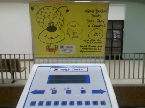 This next one is my favorite. It has a handmade sign, with a picture of a bug on it saying “Don’t bug me about my weight!” The bug is even wearing a collar that says “Bugsy”. HA! Love it! And guess what? It’s still only a quarter! You can’t beat that folks! I don’t think this one speaks Spanish though or gives me my lucky lottery numbers but that’s ok. Bugsy makes it all worth it.