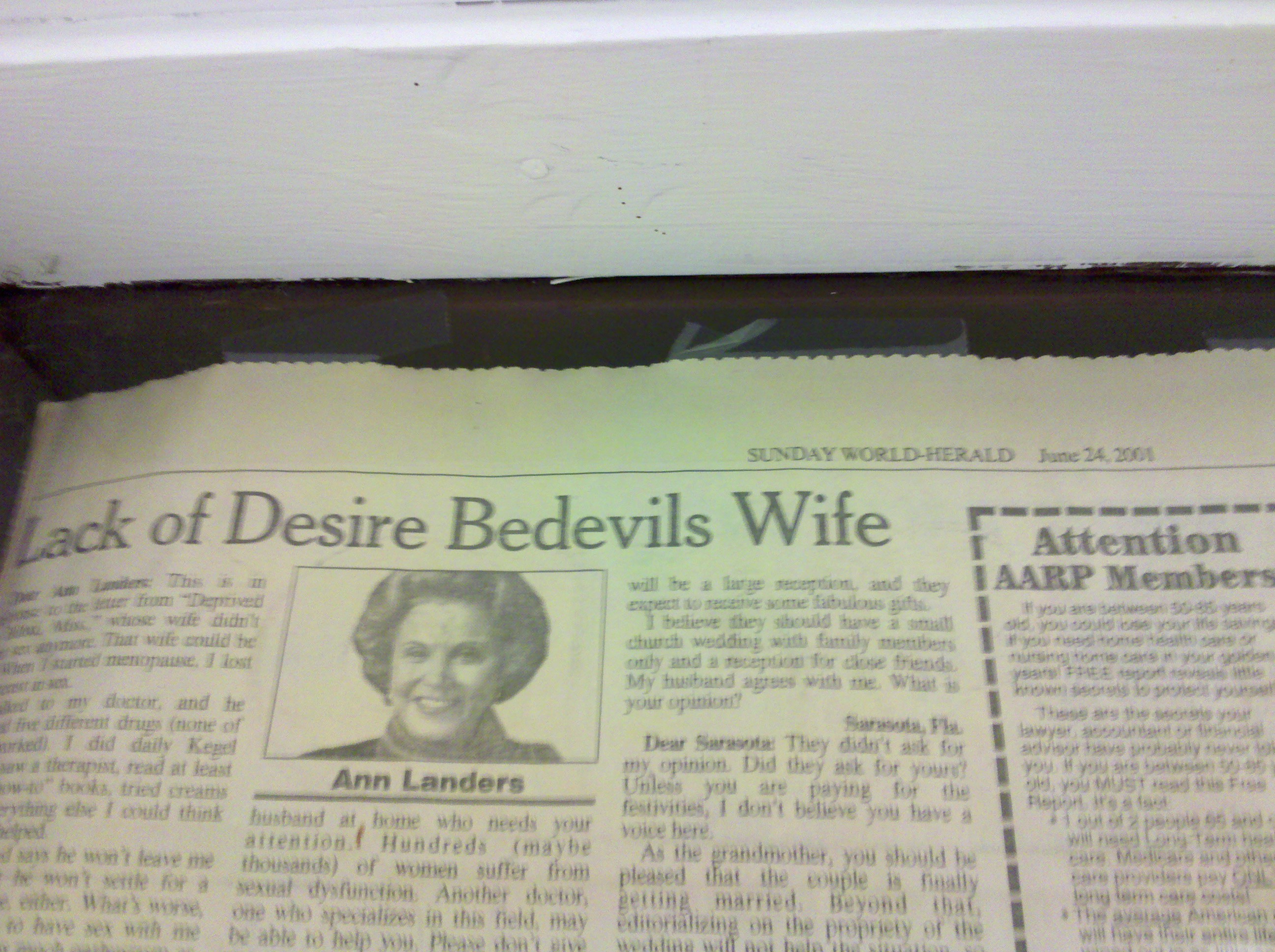 Here is a window we found that was boarded up with newspaper. Notice the date on the newspaper – June 24, 2001. That’s 10 years ago! I also like the Ann Landers headline – “Lack of Desire Bedevils Wife”. Tell me more Ann!!