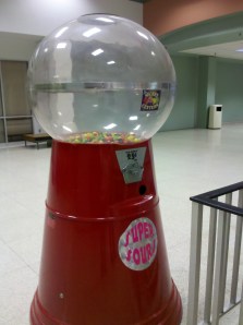 The giant gumball machine is nearly empty so the gumballs (with their “Secret Centers”) must be popular. Or else that machine has been around since the mall opened 44 years ago and it’s taken that long to empty it. At any rate, I’m not sure how old those balls are but they’ve gotta be pretty old. And who wants old balls? I mean, really.