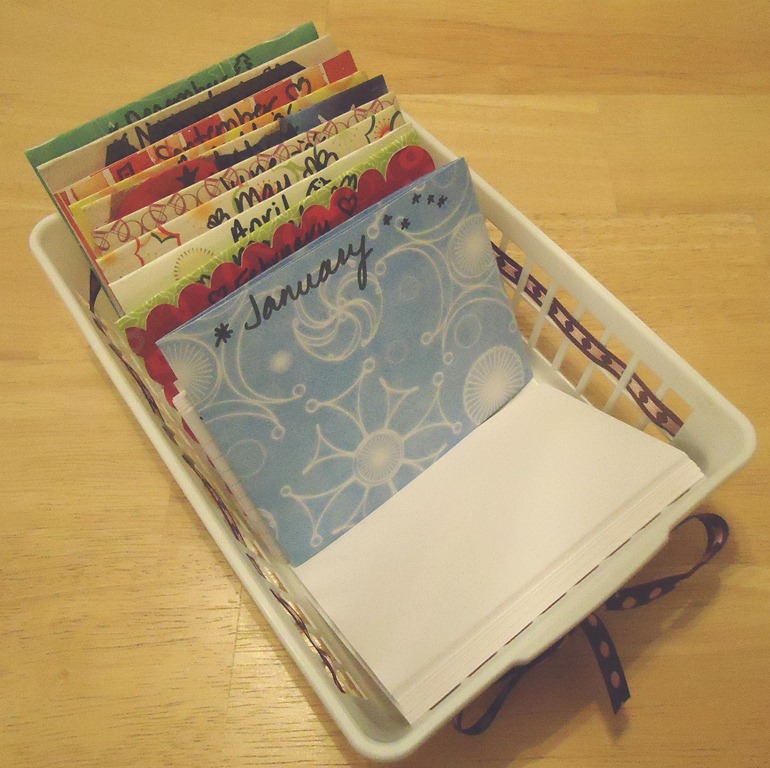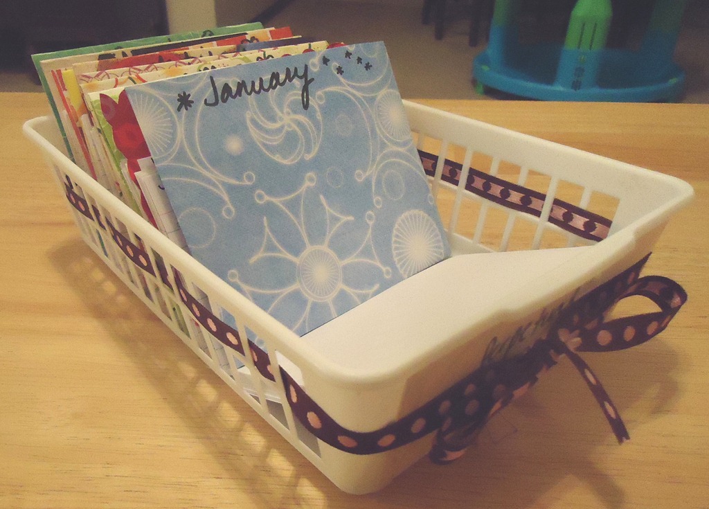 All you do it write (or stamp) the date on top of each index card and put them in the basket. If it was a holiday, I wrote the name of the holiday on red at the top, to distinguish it. Then you take the paper you got for dividers and cut/fold them to size. I used scrapbook paper that I already have and folded it to be thicker, then cut the edges to the right size. The dividers should be a bit taller than the index cards. I also chose paper to correspond with the month, to make it more fun (snowy paper for January, Valentine’s paper for February, etc). Put a divider before the index cards of each month (you can write the month on top if you want) and you’re done! You can then decorate the basket or leave it as is. I weaved a ribbon around mine and called it good.