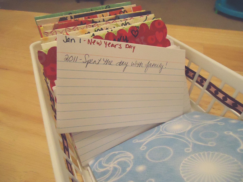 See, it’s basically a bunch of index cards placed in a basket with the date written on top (just the month and day, not the year). Then, each year, you write the year on one line along with a quick note about what happened that day. There’s no pressure to write a novel, and you can start to see over the years how your life has changed ( or not ) as you compare events from the past. It’s super easy to make too!