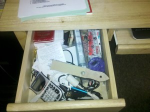 Then I tackled the drawer. Most of the stuff in there was random little things that we don’t need. A lot got tossed. The rest got sorted and organized into containers. Then the desk itself got arranged a little neater.