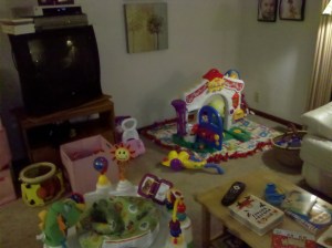 Note: I put the shelves together last night after Munchkin went to bed and it involved a lot of hammering. CJ was vacuuming at the same time. She slept through all of it and the woke up 15 min. after we were done because she couldn’t find her woobie.