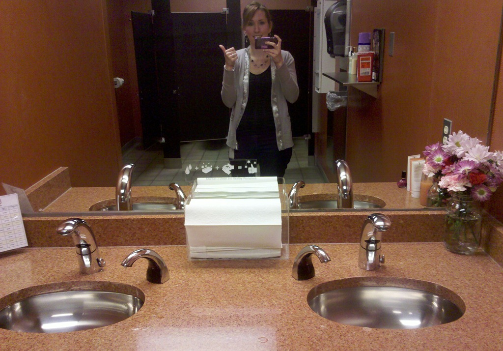 Yes, I took a picture of myself in the bathroom at work and the whole time I was terrified someone would walk in on me and I’d have to explain that I was shooting pictures for my blog. At which time I’d have to further explain that no, my blog is not about bathrooms but about quirky goings on at the office. And then it would get awkward and I’d run away in shame. But thankfully no one walked in so I dodged a bullet.