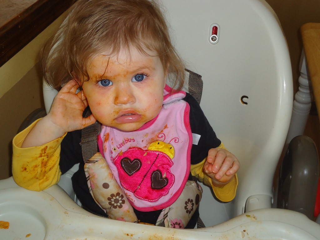 Though you can’t tell by the look on her face, you can tell by all the sauce on it that Isabella really enjoyed her Beefaroni at lunch!