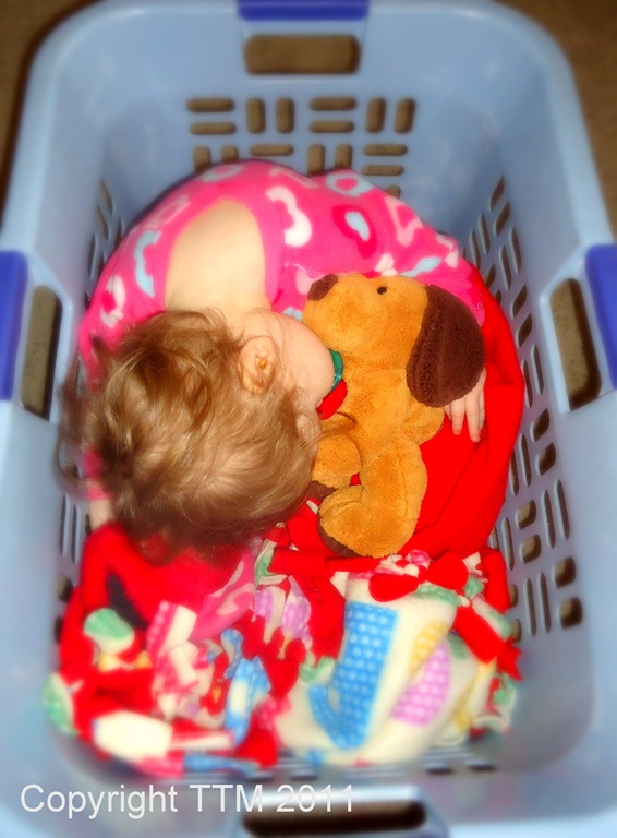 Would you believe me if I told you this wasn’t staged? Well it wasn’t. She threw a bunch of toys in the laundry basket, then climbed in herself and curled up with her puppy. I wish all laundry was this fun to pick up!