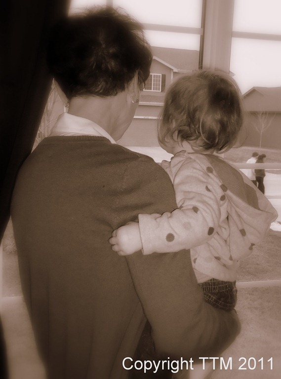 Looking out the window with Grandma (my mom), watching some neighbors walk by. She was talking away, naming all the things that she saw. So cute!