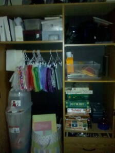 I started with the storage cabinet. It’s basically divided in half with the left side open from top to bottom, with a shelf on top and a rod for hanging stuff. The right side is split into a cabinet on top (with 3 shelves) and 2 drawers down below. The shelves I use to store all my cameras (I have 5), miscellaneous scrapbook stuff, and board games. The drawers contain candles and candle accessories and the left open side is for gift wrapping.