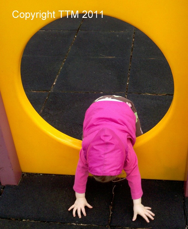 The last time I brought Isabella to this park was in the fall of 2010 (probably Octoberish). Back then, she was new to walking and hadn’t started climbing or anything so there wasn’t much she could do. This time she was all over the place! I pulled her out of the stroller and she took off! The first thing she did was run to a big circle cut out and crawl through it. She loves to go through things like tunnels and what not.