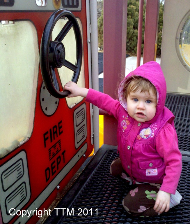 I took her around to show her the stairs and she quickly climbed up them. At the top there were all kinds of things to do, like driving a fire truck…