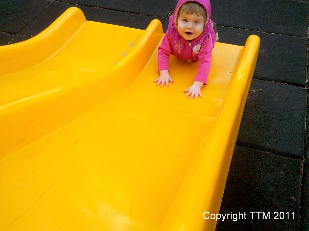 Then she ran over to the slides. She hasn’t quite figured out yet that slides are for going down, not up. She always tries to climb them.