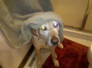 As soon as Samson saw the blue tape this morning he backed up and slowly exited the bathroom. Then looked at me, looked back in the room and back at me, as if to say, “Mom! There is danger ahead! Enter at your own risk!”