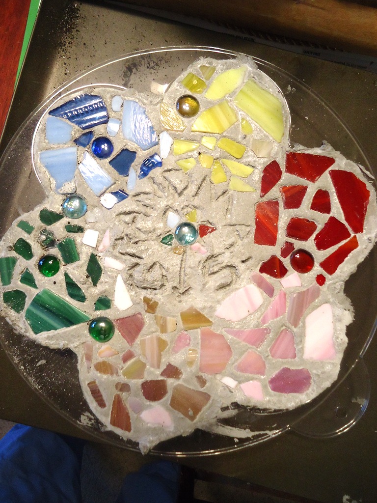 And here’s the mom’s gift I made. It’s a mosaic stepping stone for the new rock garden my parents are putting in. I was going to have Isabella put her handprint in the middle but she threw a big fit so instead I wrote “Grandma’s” and drew a little flower to represent her garden.