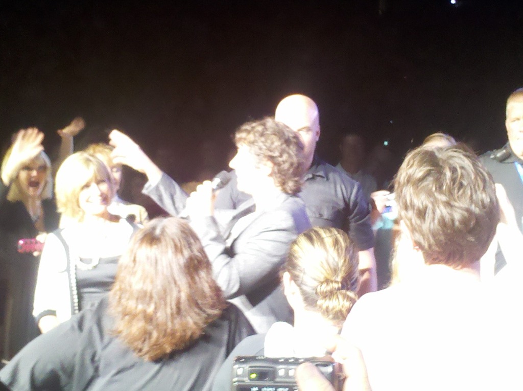 So it ended up with 7 people up on stage with him. He had the crew bring out couches, some wine for the adults and some milk for the younger ones. He sat with them and chatted. He even flirted a little with one of them. I have to admit I was a tad jealous. Then he sang a love song to them all and that finished the first set.