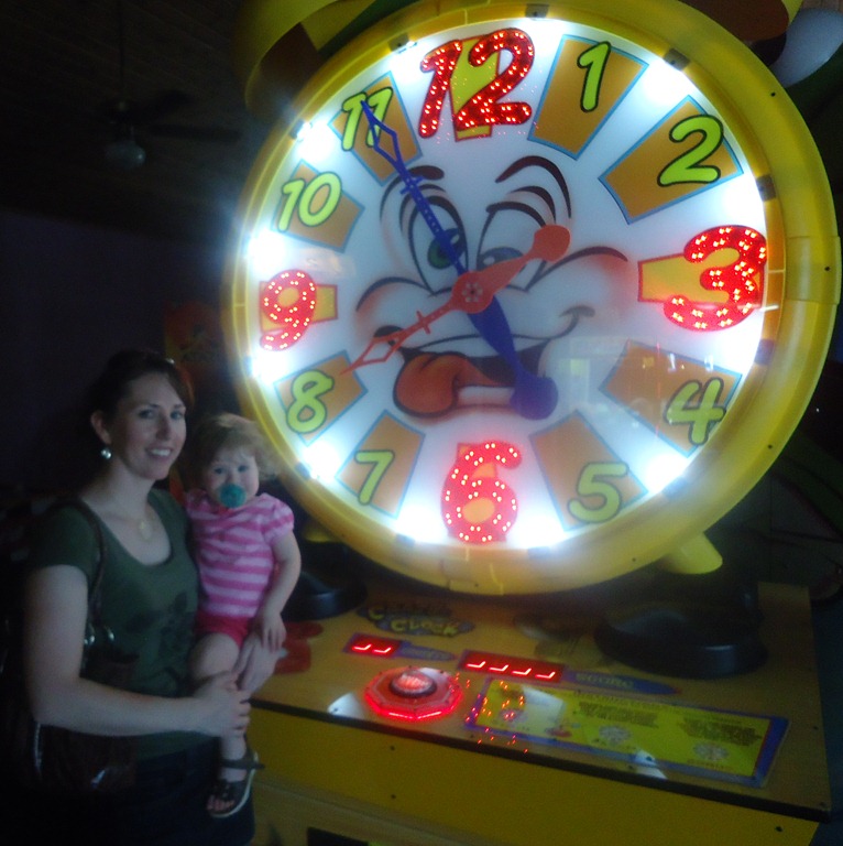 Isabella really enjoyed the time with her aunt and uncle. Chuck showed her the “Crazy Clock” in the arcade which she still talks about! Later she insisted on taking me and CJ back to show us the Crazy Clock!