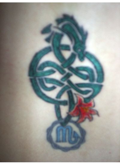Then in Australia a few years later I got the Scorpio symbol on my lower back (tramp stamp!). In 2007 I added to the tramp stamp and got a Celtic Dragon (for my Irish background and the Dragon for the Chinese year I was born in) holding a stargazer lily (my wedding flower). The dragon’s tail winds through the Scorpio tat. I’ll probably get one more in a few years to honor my kids. Not sure what yet but that will be the last one.