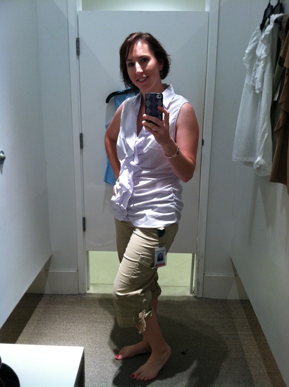First of all, pardon my bad hair day. It was really humid and I was pulling shirts over my head a lot. Secondly, I kind of have a crazed look in my eye. I think I was trying to smile, look in the mirror and look at the camera all at the same time. The result – crazy-eyed Sarah!