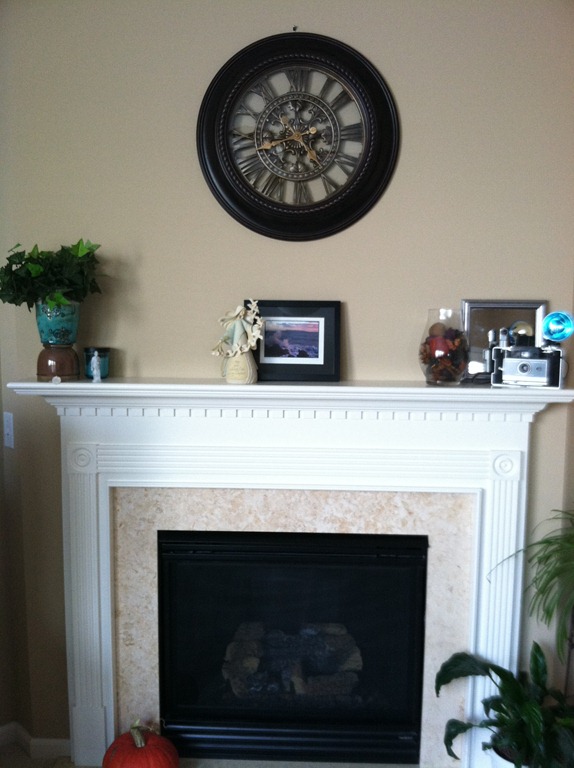 The fireplace is coming along. Right now I think this all feels too symmetrical so I have to play with it more. Also needs more height. But it’s a starting point. I love the old polaroid camera on the right side. I found it at a thrift store for $9. I put it there to reflect our love for photography. The pic in the middle is from Ireland, which was the trip on which CJ proposed, and the angel next to it was a gift from my parents when our last baby died. I also plan to put the urn up on the mantle with the baby’s ashes in it. The big clock hanging on the wall was a house warming gift from our real estate agents.