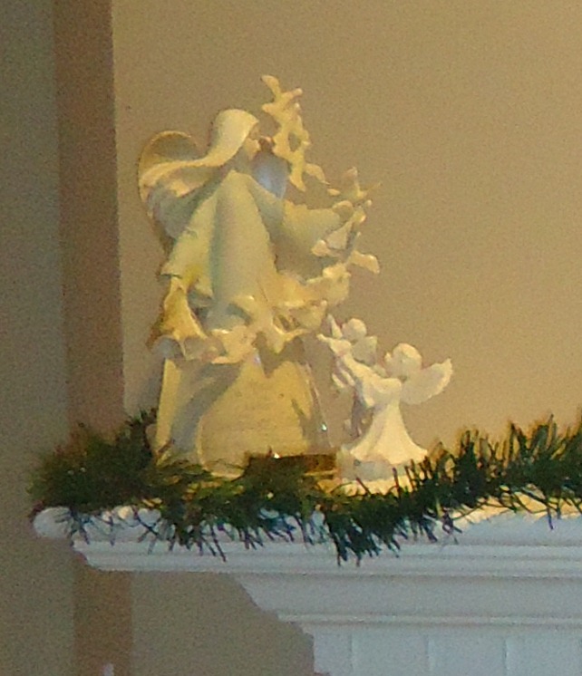 The Angel memorial is to honor the babies we have lost. The little one we got after my first miscarriage in 2008. The large one was a gift after the latest miscarriage in September. And the little silver heart box in front (which you can’t see real well) holds the ashes of that last baby. Even though we took down the normal everyday décor to make room for holiday stuff, we had to leave our angels there on the hearth. They’re a part of the family.