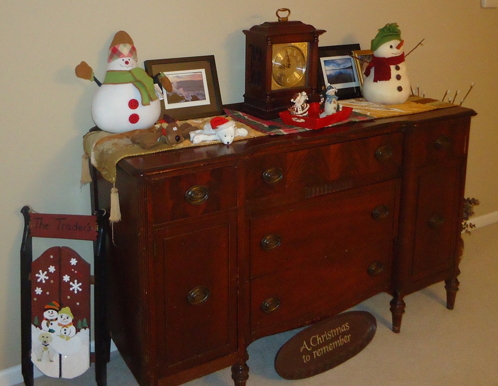 The snowmen atop the dining room buffet.