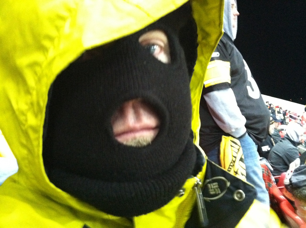 Here’s what I did wear: jeans, a long sleeve t-shirt, short sleeve t-shirt, sweatshirt, jacket, scarf, hat, gloves, socks and regular boots (and of course my Terrible Towel which actually became a good blanket later on).