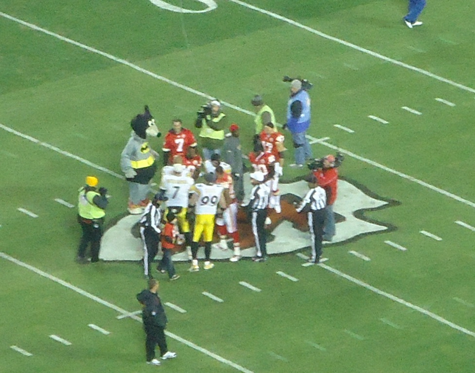 The game itself was stressful because Pitt didn’t play as well as they should have. Let’s face it – everyone was expecting them to roll over the Chiefs. Even the 3 dudes in front of us, who are Chiefs fans, were like, “Wow, you guys must be upset that you’re not winning by more.” Um, yeah we were. I don’t know what it is about KC but whenever the Steelers come there, they choke. When CJ and I saw them there 2 years ago, same thing happened only they actually lost that game.