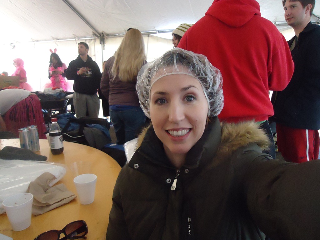 It’s quite tricky doing the clothing change. For one, there are like 50 women shoved in this tent all franticly trying to peel off they’re frozen clothes as fast as they can. Then of course there’s the challenge of peeling off wet sticky clothes, drying off your skin and putting new dry clothes back on. There’s no way to do it fast. And forget about being modest. You have to pretty much strip down naked as fast as you can. No one really looks or cares. They’re too worried about their own frozen toes.