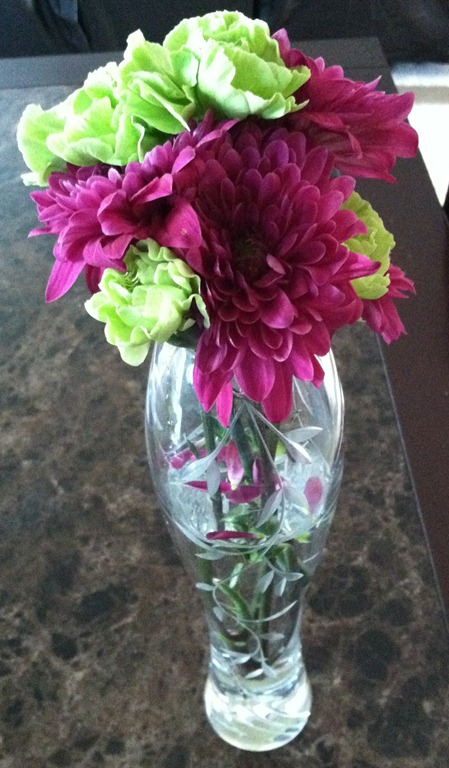 I bought a bouquet on sale for $5 the other day and split it up. This vase is sitting in our dining room.