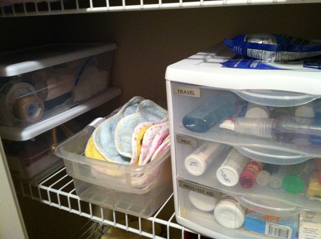 I culled through our towels and sheets, getting rid of ones that were old or mismatched. I kept enough for each of us to have 3 towels each, and 3 sets of sheets (for me and CJ – Isabella’s bedding is stored in her room). I also went through all the toiletries, medicine, and other paraphernalia and organized it.