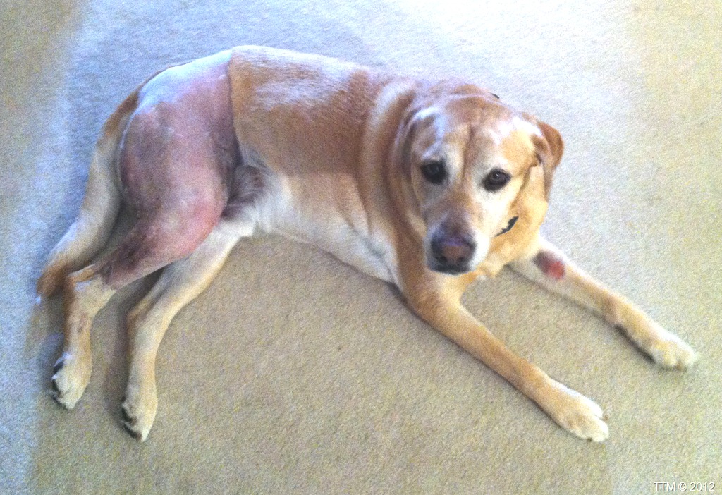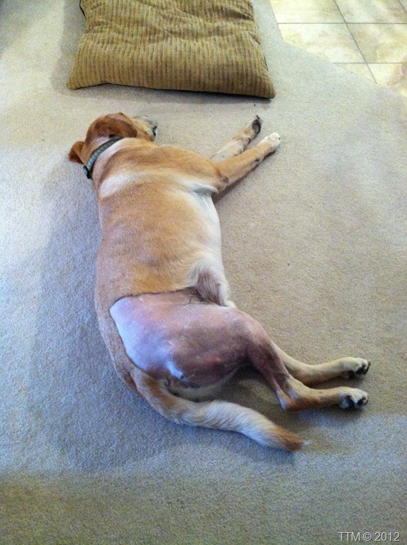You can see that his whole back leg is shaved. I feel embarrassed for the guy, having half of his hind quarters exposed for the world to see. I hope it grows back soon.