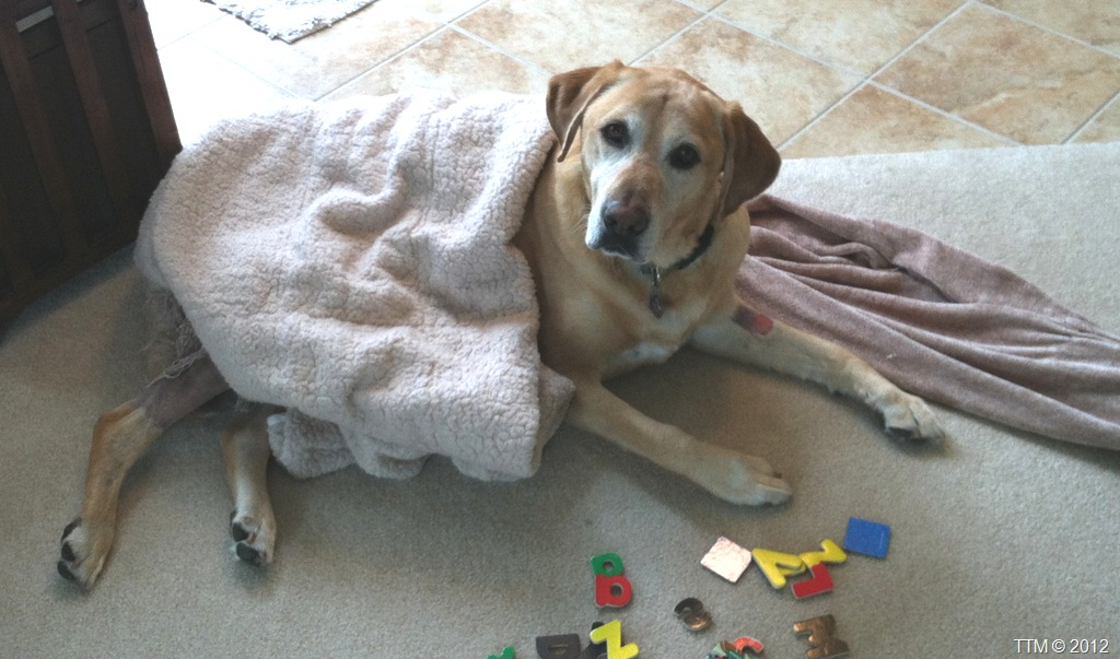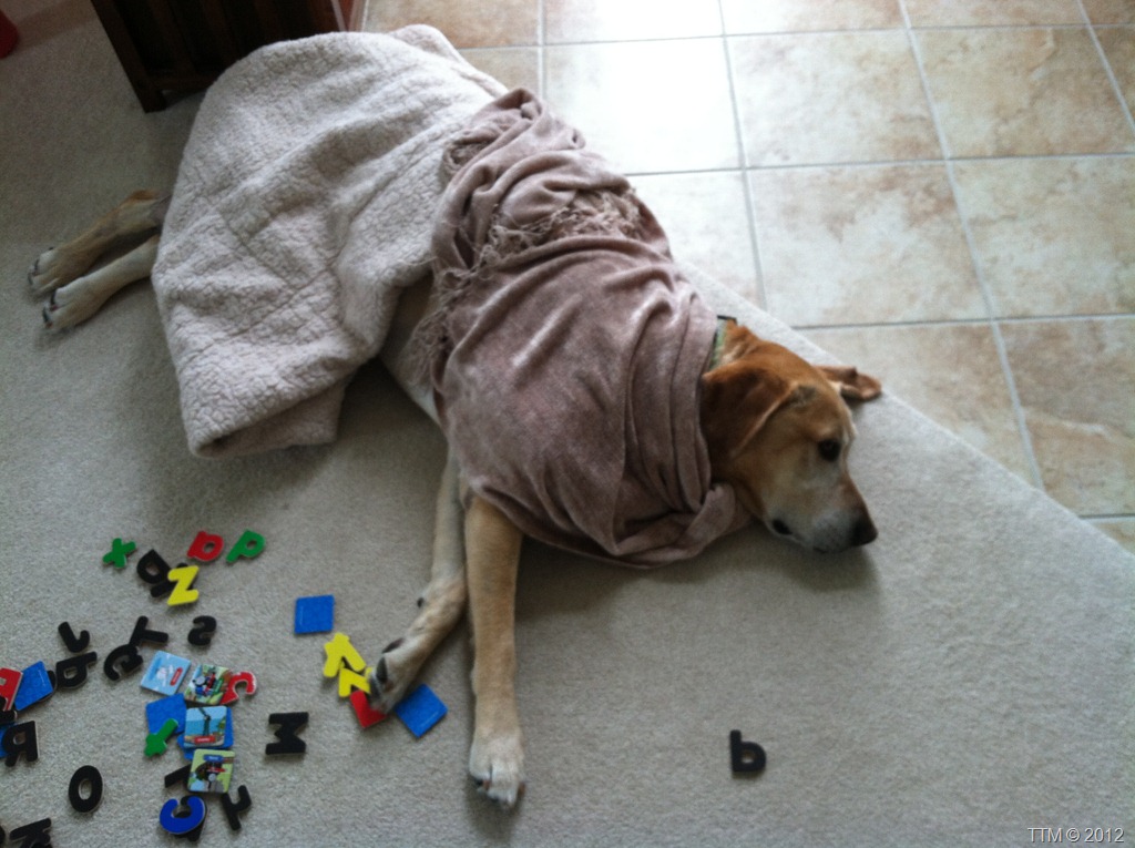 Isabella was trying to help Samson be extra comfortable so she started putting blankets over him. He just laid there and let her do it.