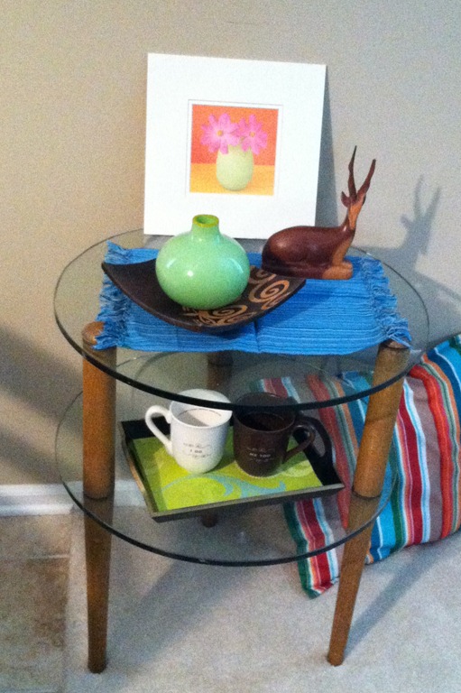 This is an antique end table that was gifted to CJ. I finally brought it up and put some stuff on it.