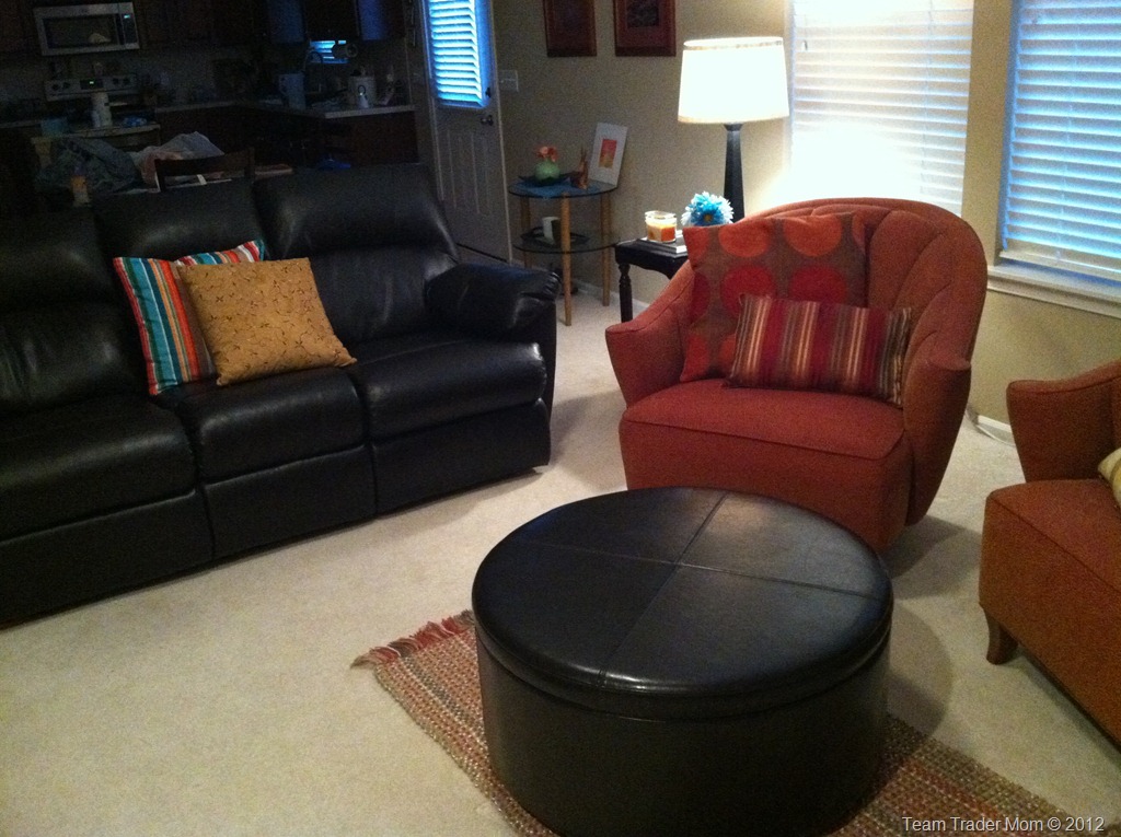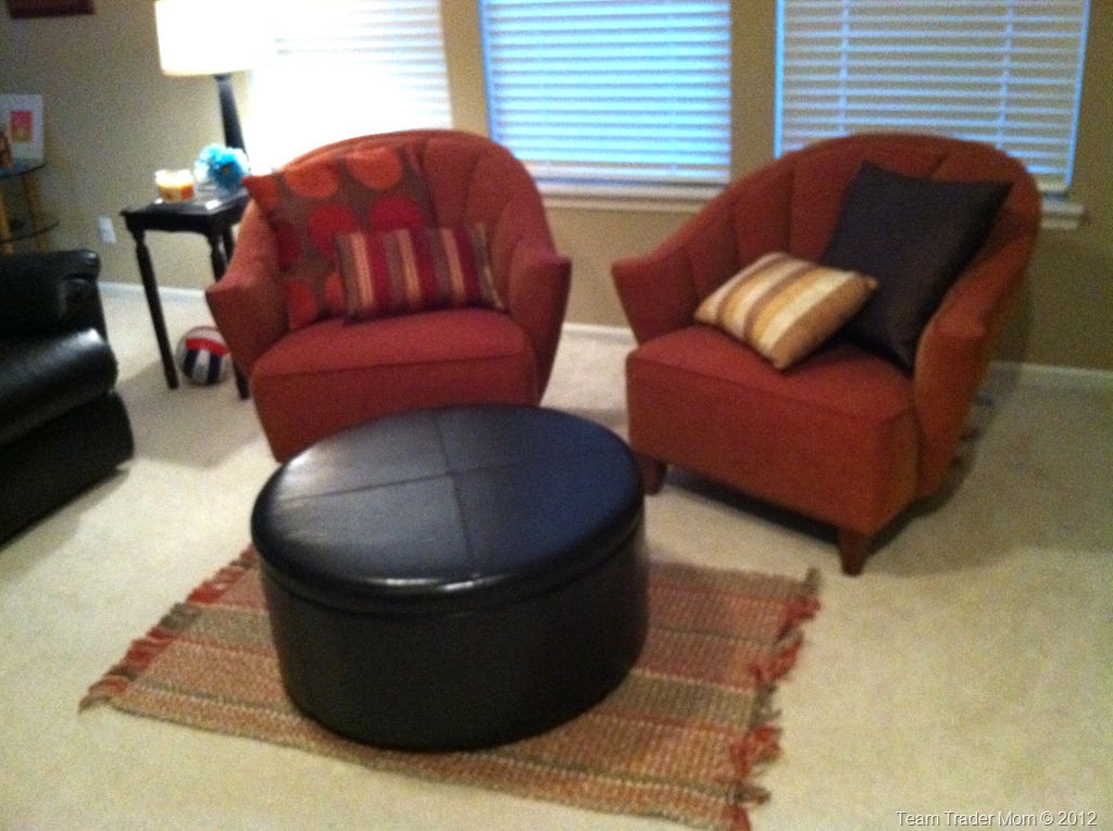 By the way, those orange tub chairs were a garage sale find by CJ. He got both for $30. We had them in the basement of the old house, just to stage it, figuring we might get rid of them once we moved. The movers plopped them in the living room and we loved how it looked and ended up building the rest of the room around them!
