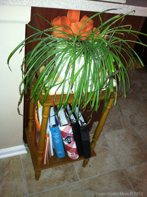 While I was sorting through kitchen boxes, I came across my stack of cookbooks. I don’t use all of them (a couple I’ve never used), but they’re a natural item to display in the kitchen so I put them on the bottom of this accent table.