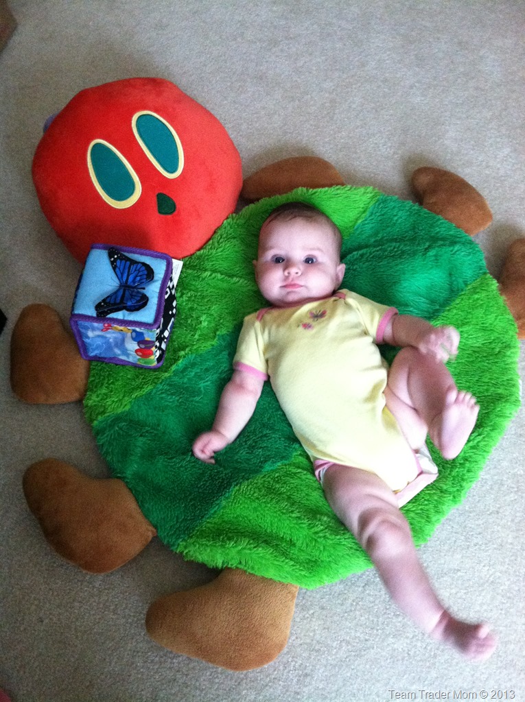 With rolling over, she’s trying to kick from back to front. She will get about 3/4 of the way there, get stuck and then flop back. It’s kind of funny to watch. One of these days she’s just going to flip on over and surprise us all!