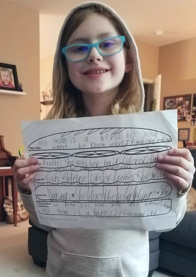 Isabella was asked to do a writing assignment about a hero. She had to include a main idea, 3 details, and a concluding sentence. Of course because she’s my daughter she did extra credit and added 2 extra details.