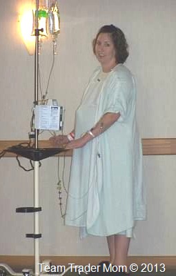 At some point the doctor came and manually broke my waters. The warm gush of fluid felt very strange. The contractions became more frequent and severe and I just wanted to stay in my room and cry. Oddly, the most comfortable place was sitting on the toilet! The nurse said that was normal as sitting over the opening helps to relieve some pressure. I sat in the bathroom for a long time…until they made me come out. At one point my mom came in the room and sat with me while I rocked in the rocking chair.