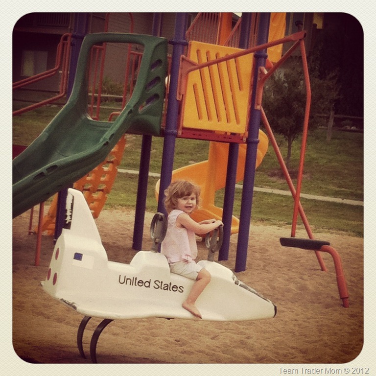 This week we stopped to play at the park. My original plan was to just walk and push her in the stroller but she so badly wanted to stop and play. Plus, I figured it was probably the best time to do it, given it was the coolest part of the day. So we stopped and she rode the shuttle to outer space!