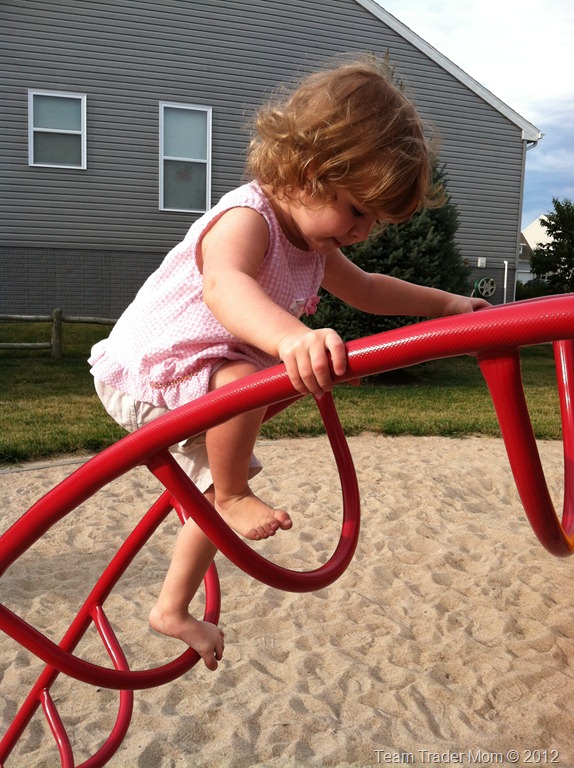 If you ask her, Munchkin will tell you that she climbed the “equipment”. Heaven forbid she use a word that most kids would use like “ladder” or “steps” or “bars”. No no, she climbed the equipment.