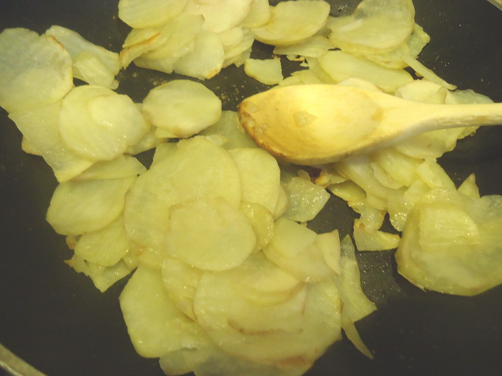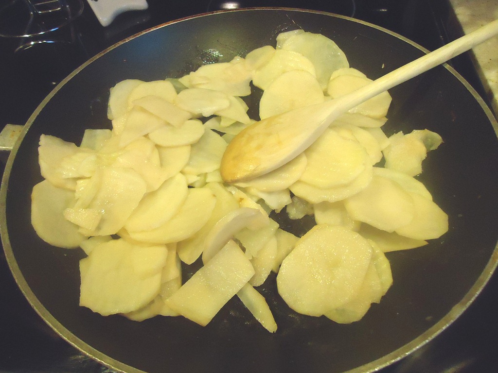 Step 3. Cook the potatoes until tender but not brown. They should turn from opaque to transparent and get kind of shiny.