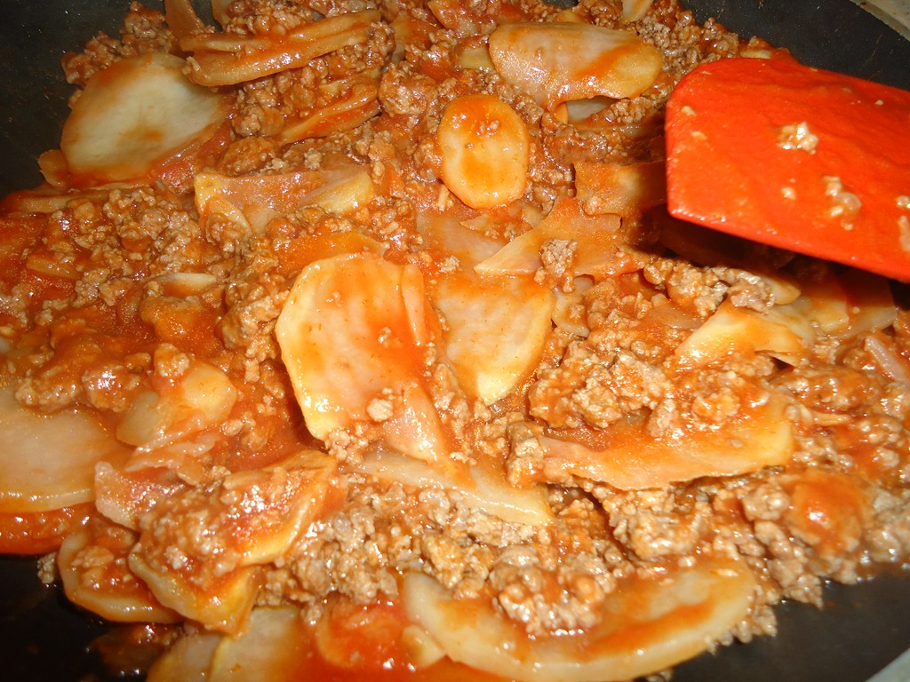 Step 5. Drain the grease and then add the potatoes back in, along with 1 – 16 oz. can of tomato sauce and some parmesan cheese to taste.