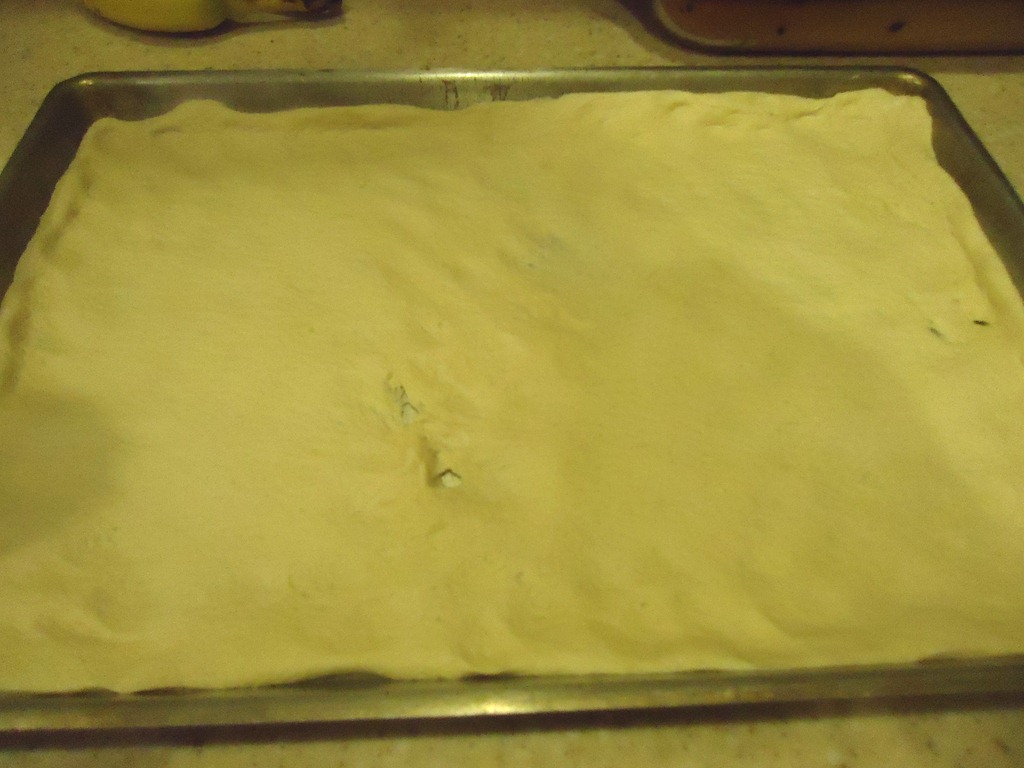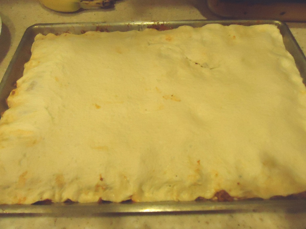 Step 9. Unroll Pillsbury refrigerated pizza dough crust #2 on top of the meat mixture. Pinch the edges together to seal it up (hence the reason for leaving the gap on the sides)