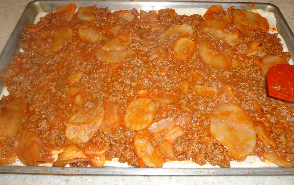Step 8. Pour meat mixture on to the pizza dough. Spread evenly, leaving room around the edges.