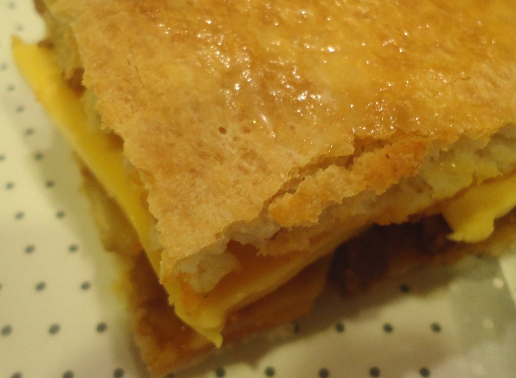 Then cut a slice or two of your favorite cheese and slip it under the top crust, setting her down right on the meaty middle. Let it melt before eating.