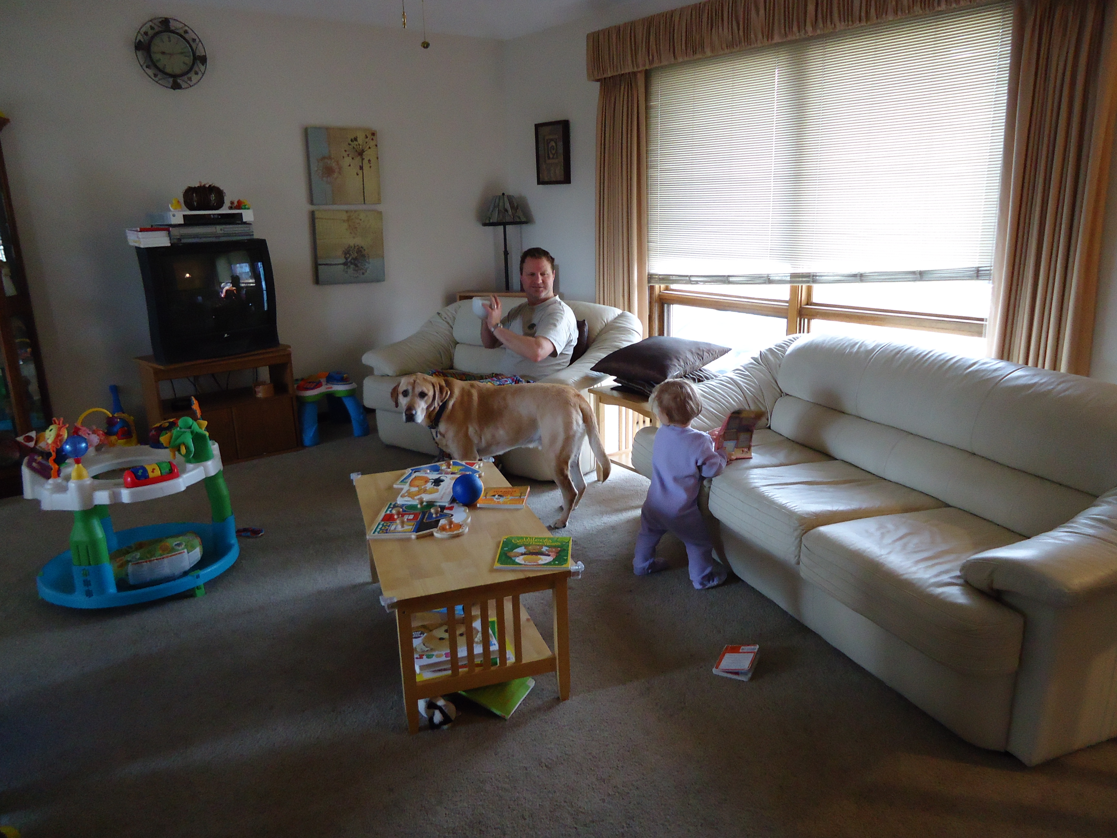 There’s my family – CJ having his coffee, Isabella running around and Samson begging for food. Typical Sunday morning. Also, notice that one of the canvas paintings on the wall, next to the TV, is upside down. This is where I point my finger at CJ. He does that on purpose to see if 1) I notice and 2) I will fix it. Yes, I’m a little OCD and yes normally that would bug me to no end. But what he didn’t realize is that I actually like it better that way. Ha! In your face buddy!