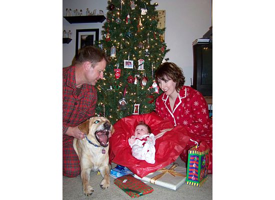 He looks like he’s about to eat the baby! Notice the look on my face that says “I”m going to keep smiling even though I don’t know what the hell you are doing dog!!” Munchkin is even looking at him like “Wha?” Eventually we gave up and cut him out of the pic. Sorry dude. Hopefully both he and Munch will cooperate this year. Lord help me.