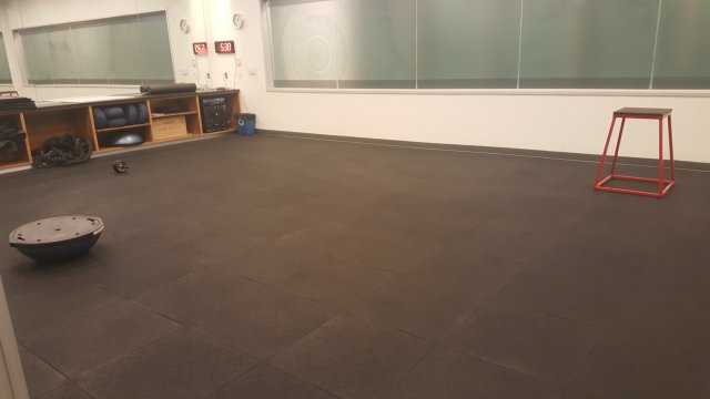 3 pieces of equipment left out on the floor of the room. Perhaps this person was so wiped out after their workout that they simply had no energy left to put away the box and Bosu ball. Or maybe they tried to jump on that tall box and fell, hurting themselves so bad that they just couldn’t clean up.