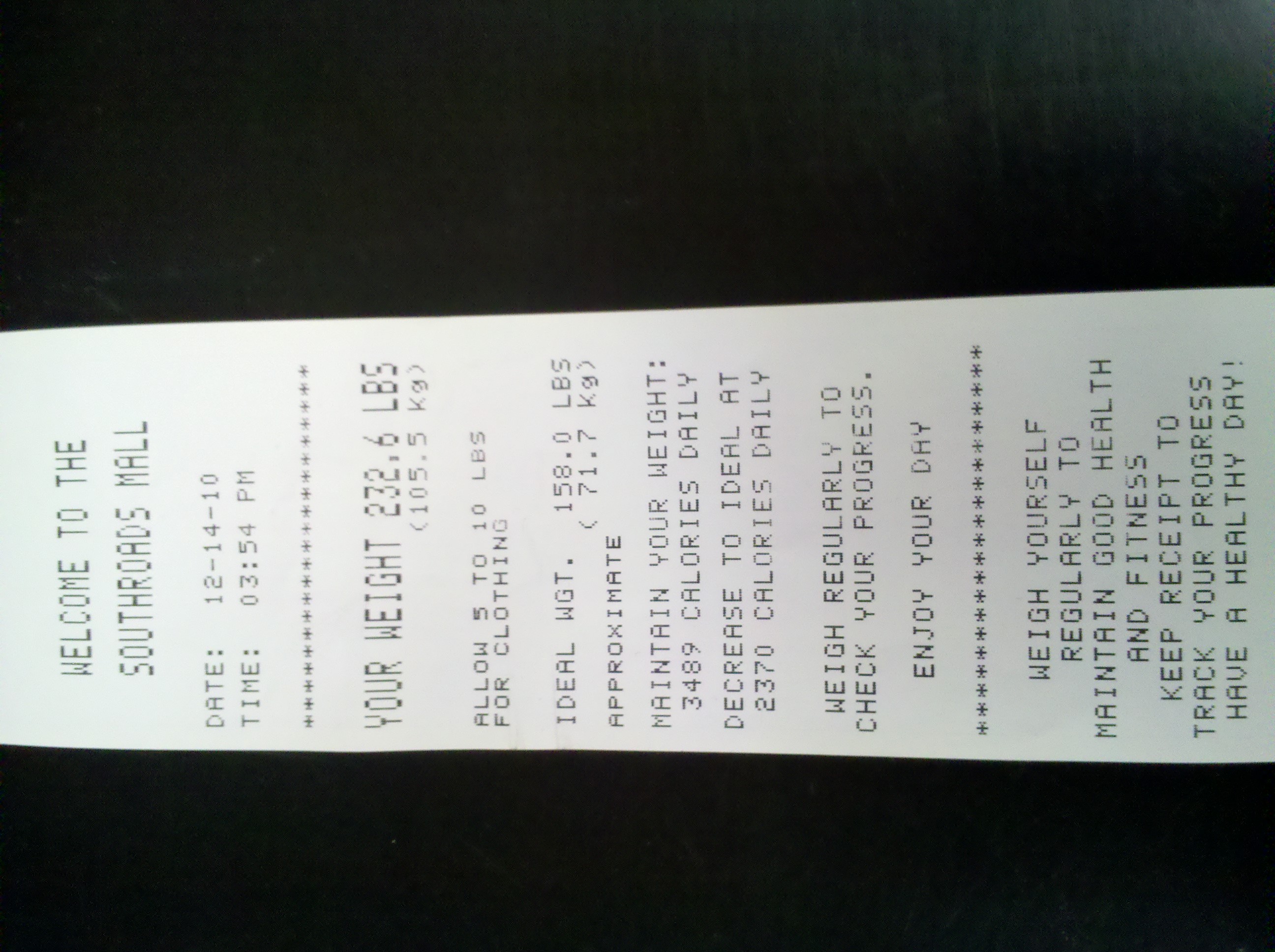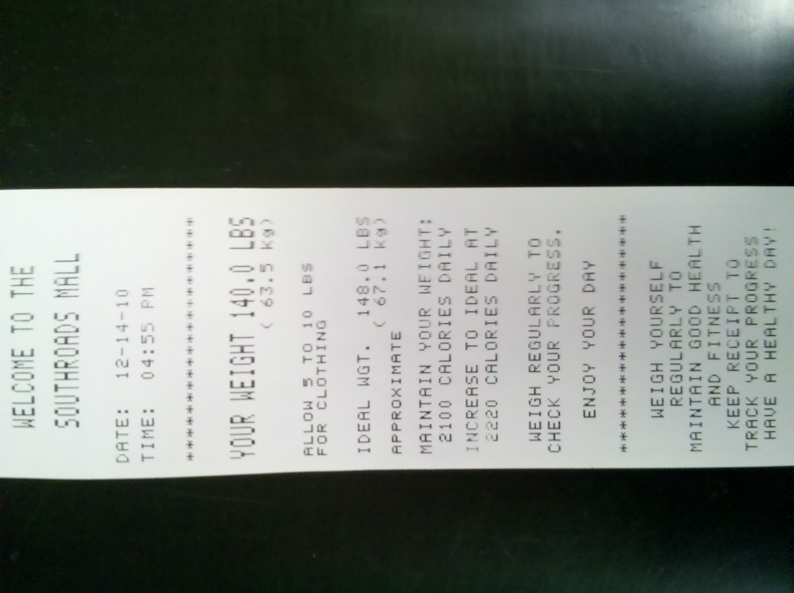 What a find! Apparently someone had weighed themselves just minutes before I arrived and forgot to take their printout with them! Suh-weet! Naturally I snagged it and here’s what I gleaned: