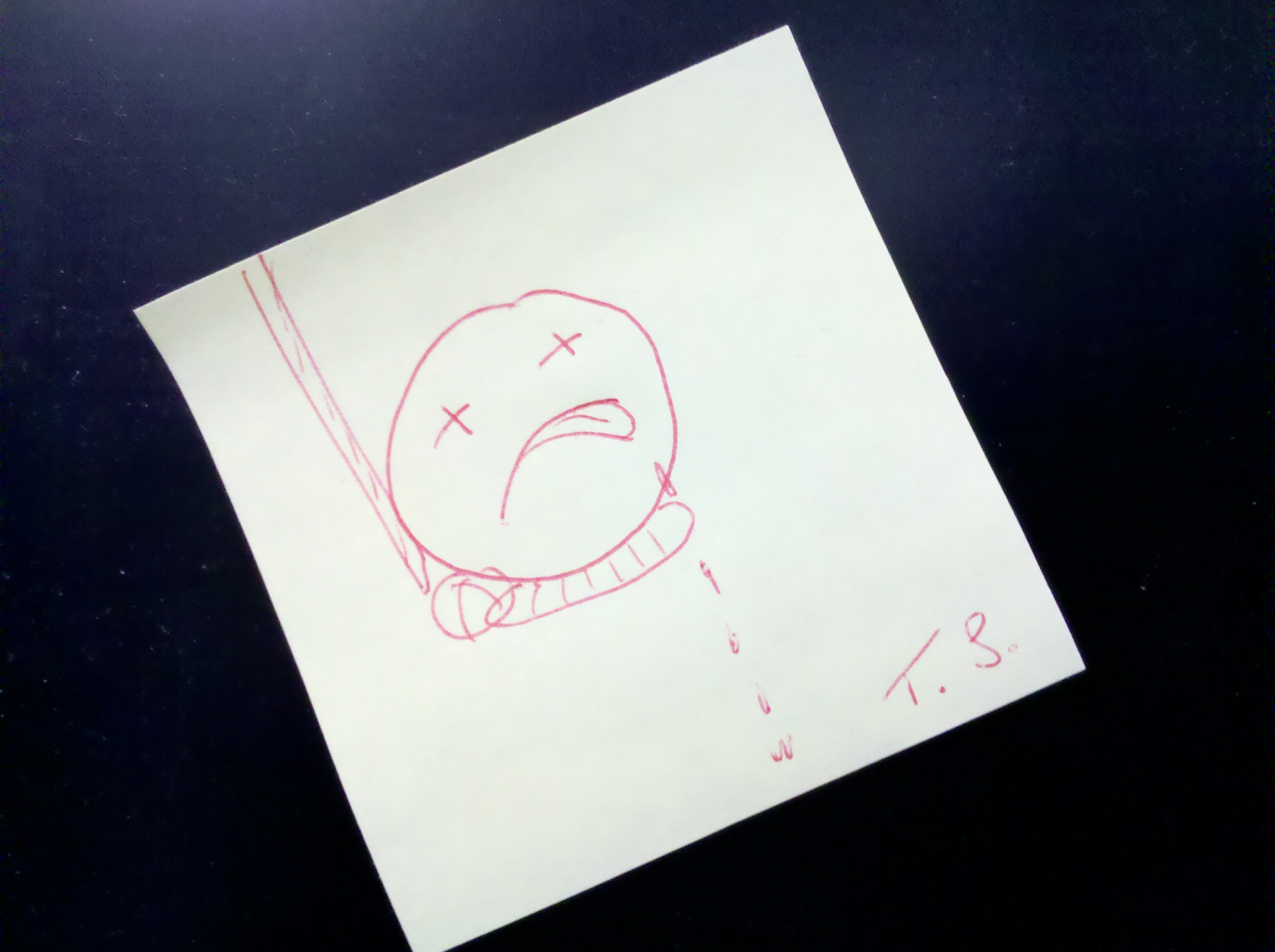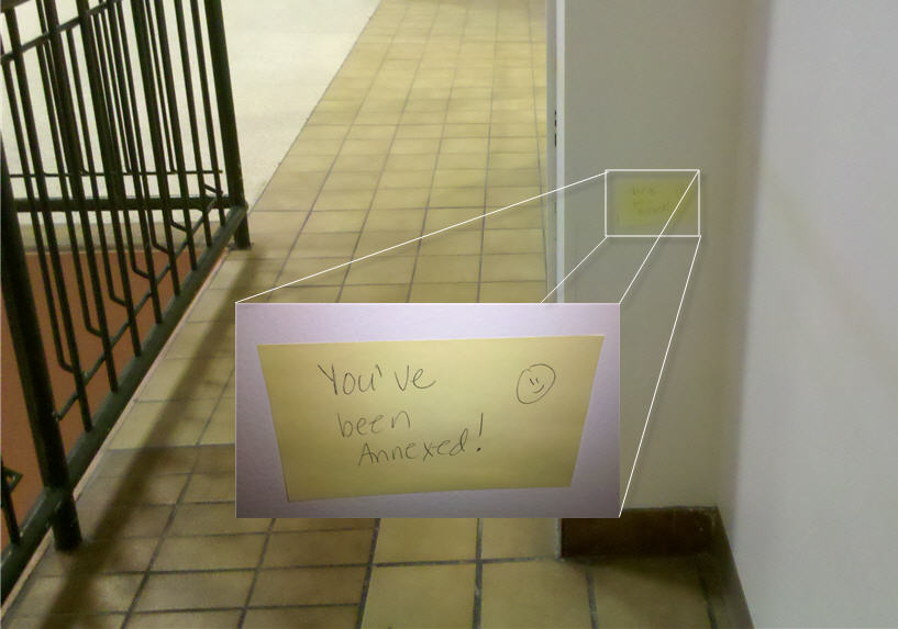 Post-it Note: I stuck a post-it to the wall next to the cafeteria. It was lower on the wall and somewhat inconspicuous. I wrote “You’ve been Annexed :)” on it.
